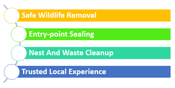 If noise returns, act quickly before they settle in again. Ask for a full exterior inspection so small gaps don’t get missed. Keep branches trimmed back from the roofline to reduce access points. A follow-up check a week later helps confirm everything stays sealed.